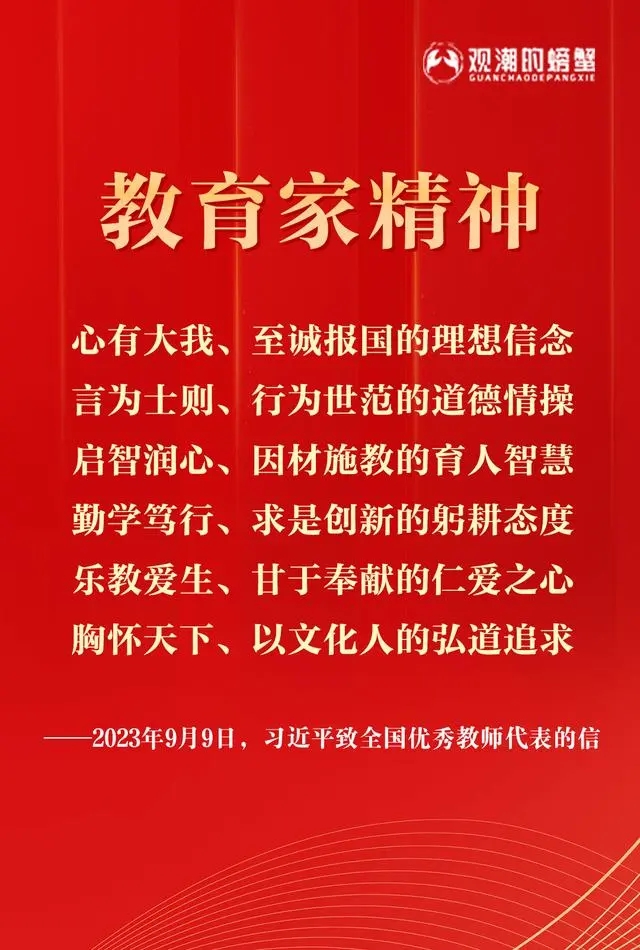 习近平在信中说,长期以来,以你们为代表的全国广大教师认真贯彻党的教育方针,教书育人、培根铸魂,培养了一代又一代德智体美劳全面发展的社会主义建设者和接班人,造就了大批可堪大用、能担重任的栋梁之才,为国家发展、民族振兴作出了重要贡献。教师群体中涌现出一批教育家和优秀教师,他们具有心有大我、至诚报国的理想信念,言为士则、行为世范的道德情操,启智润心、因材施教的育人智慧,勤学笃行、求是创新的躬耕态度,乐教爱生、甘于奉献的仁爱之心,胸怀天下、以文化人的弘道追求,展现了中国特有的教育家精神。