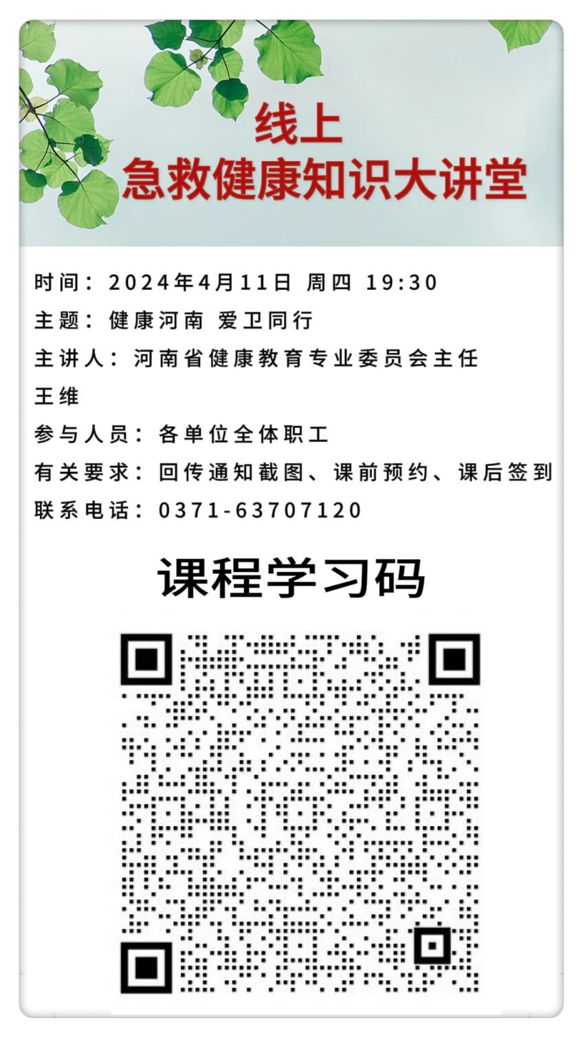 生命健康是每名职工生存和发展的基本条件,是家庭幸福、工作顺利的必要保障,是推进学校事业发展的根本基础。希望通过本次学习,能够提高教职工的自我健康意识,掌握自救他救知识与能力,让我们以更加饱满的精神状态、更加充沛的精力投入到生活和工作中。请教职工积极参加并全程参与课程学习。