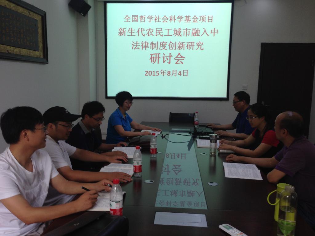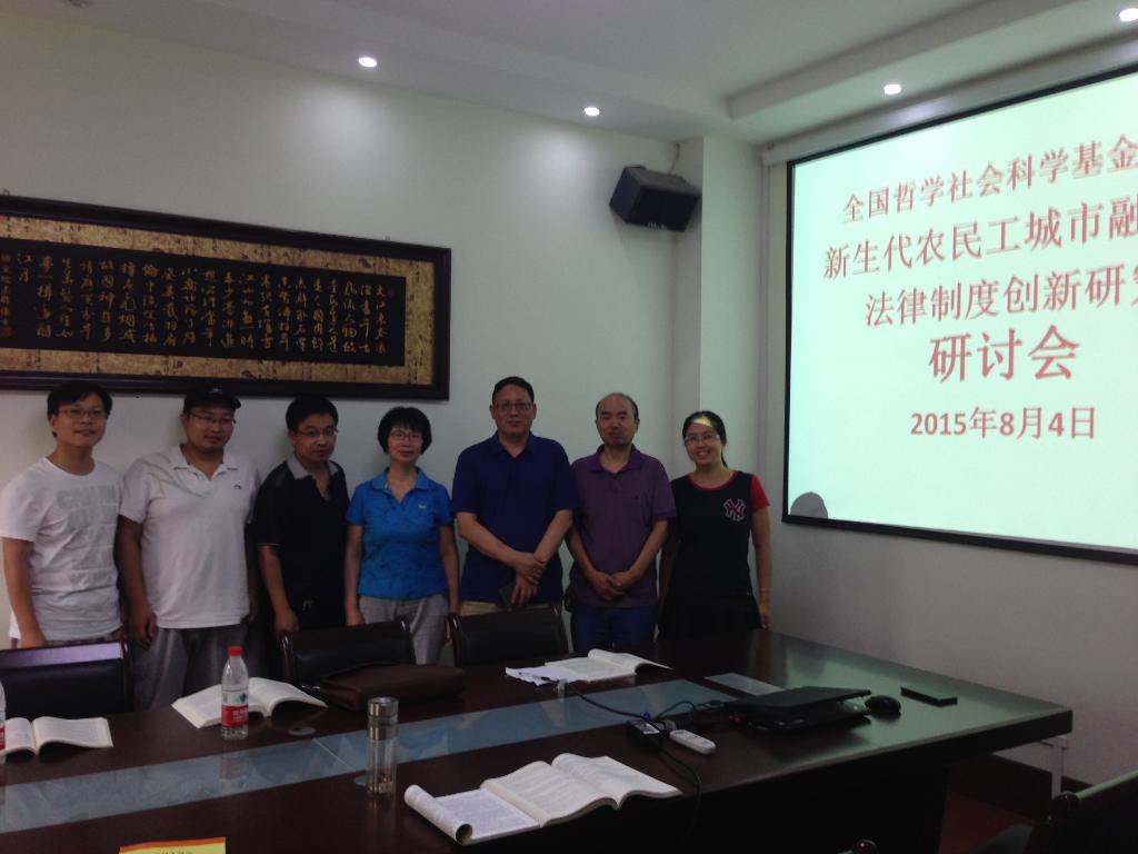 8月4日下午,法学院院长黄进才教授主持的2012年度国家社科基金项目“新生代农民工城市融入法律制度创新研究”课题组研讨会在崇法楼二楼会议室召开。我院三农法律问题研究中心常务副主任吕军书教授,课题组成员河南工业大学赵排风教授、我院赵宁博士、陈敬涛博士、葛方林博士、胡同春博士及马淑明老师参加会议。