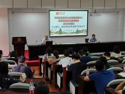 为进一步宣传落实政府采购政策,提升采购人员专业素质和业务水平,国有资产与实验室管理处于616日上午在勤政楼第四会议室开展“政府采购政策及集中采购业务交流”培训活动,邀请河南省公共资源交易中心政府采购处项目组李玉鹏主任做报告,校内各单位负责采购工作的人员参加培训。活动由副处长乔俊峰主持。