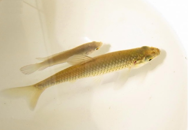 麦穗鱼(Pseudorasbora parva) 又名罗汉鱼,鲤形目鲤科鮈亚科麦穗鱼属。头尖,略平扁。口上位。无须。背鳍无硬刺。生殖时期雄鱼体色深黑,吻部、颊部出现珠星。雄鱼个体大,雌鱼个体小,差别明显。为江河、湖泊、池塘等水体中常见的小型鱼类。生活在浅水区。杂食,主食浮游动物。