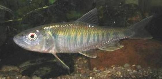 马口鱼(Opsariichthys uncirostris ) 马口鱼:俗称午仔鱼、山涟仔、桃花鱼、山鳡、坑爬、宽口、大口扒、扯口婆、红车公。鲤形目鲤科马口鱼属。为东亚特有的小型鱼类,只分布在日本、朝鲜及我国各地。上颔两侧边缘各有一个缺口,正好为下颔的突出物所嵌,形似马口,故名“马口鱼”。 栖居于河川较上游的河段,喜生活在水流清澈、水温较低水体中。即使在同一条河川中,常与与其相近的鱲属鱼类生活在一起。游动敏捷,善跳跃,性贪食,甚至可由此改变体型而极度肥胖。为小型杂食性鱼类。