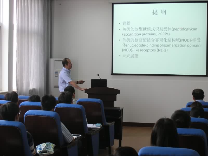 空格聂品研究员首先介绍了我国鱼类和水产养殖的现状与鱼类疾病防治方面的问题,讲解了鱼类免疫系统的组成与其它高等动物的区别,引出了目前正在研究的鱼类识别细菌肽聚糖模式识别受体(PGRP)的课题。并从鱼类细菌肽聚糖识别通道模式、PGRP的抗菌和抗病毒的免疫功能、在鱼类组织中表达分布的特点及PGRP的基因结构和剪切的多样性等方面进行了深入细致的讲解。随后,聂品研究员和与会师生进行了现场互动交流,对大家提出的问题给予了耐心的解答。会后,在水产学院二楼小会议,聂品研究员与水产学院水产动物医学系及相关研究领域教师进行了座谈,探讨了水产动物医学方向的发展问题,聂品研究员对研究方向的确立提出了宝贵的建议。