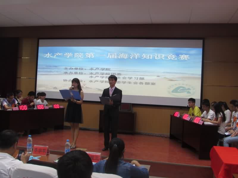 海洋知识共分享,南极梦想竞追逐。9月27日下午三点,水产学院在外国语学院报告厅举办第一届海洋知识竞赛决赛。评委团特邀请水产学院院长聂国兴教授、副院长李学军教授、杨丽萍、狄桂兰、王磊三位博士。校团委副书记李浩、学院党总支副书记李保华作为嘉宾应邀出席。2014级全体新生观看了此次比赛。