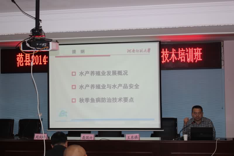 首先,范县水利局周庆峰副局长和水产股(站)的技术人员介绍了范县渔业发展的现状及存在的问题。聂国兴教授详细听取了介绍后,就范县渔业发展提出了两点建议:一是利用优势,延伸黄河金鳅产业链条,做大做强泥鳅产业;二是加强技术人员队伍建设,摸清家底,做好黄河金鳅种质资源保护。之后,聂国兴教授给范县各乡镇养殖大户作了专题培训,主要内容包括“我国和河南省水产养殖业发展概况”、“水产养殖业与水产品质量安全”、“秋季鱼病防治技术要点”等。在培训过程中,养殖户针对当前主要养殖品种和养殖模式与聂教授进行了互动交流,现场气氛热烈。