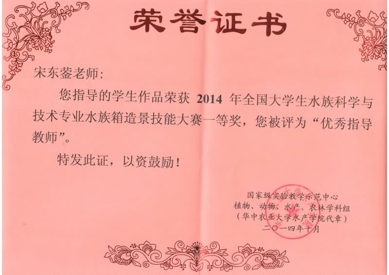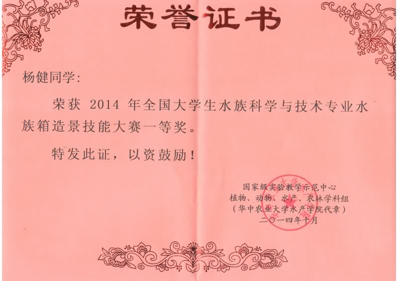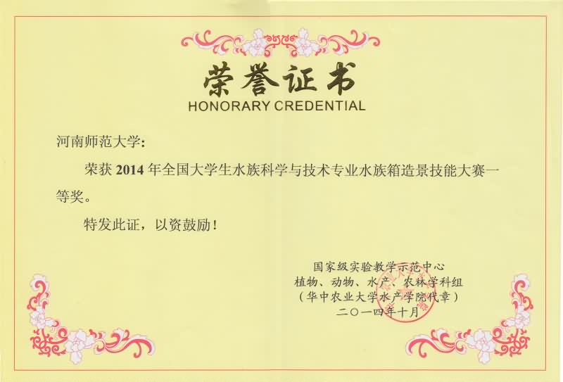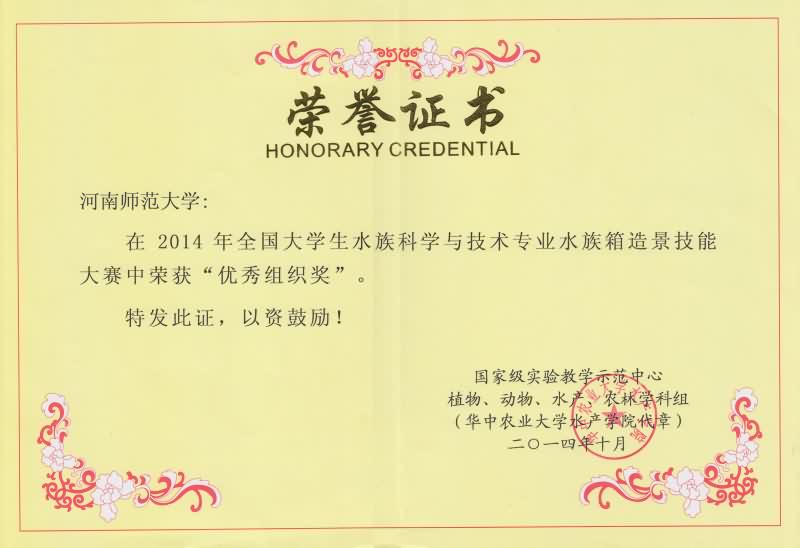 2014年10月18日,由国家级实验教学示范中心主办、华中农业大学水产学院承办的全国大学生水族科学与技术专业“水族箱造景技能邀请赛”在武汉市华中农业大学举行。我院由李学军副院长带队、杨健、黄双双、陈宏霖同学组成的参赛队伍应邀参赛,经过一天紧张激烈的角逐,最终荣获大赛校际组一等奖。参赛的队伍还有华中农业大学、上海海洋大学、湖南农业大学、青岛农业大学、天津农学院、大连海洋大学和上海应用技术学院等8支校际队和华中农业大学的30支校内队。另外,我院还获得“优秀组织奖”,参赛的孟晓林老师和宋东蓥老师分别获得“优秀指导教师奖”。
