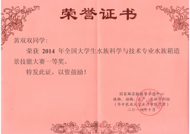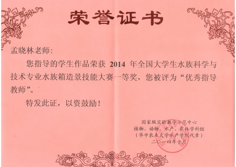 2014年10月18日,由国家级实验教学示范中心主办、华中农业大学水产学院承办的全国大学生水族科学与技术专业“水族箱造景技能邀请赛”在武汉市华中农业大学举行。我院由李学军副院长带队、杨健、黄双双、陈宏霖同学组成的参赛队伍应邀参赛,经过一天紧张激烈的角逐,最终荣获大赛校际组一等奖。参赛的队伍还有华中农业大学、上海海洋大学、湖南农业大学、青岛农业大学、天津农学院、大连海洋大学和上海应用技术学院等8支校际队和华中农业大学的30支校内队。另外,我院还获得“优秀组织奖”,参赛的孟晓林老师和宋东蓥老师分别获得“优秀指导教师奖”。
