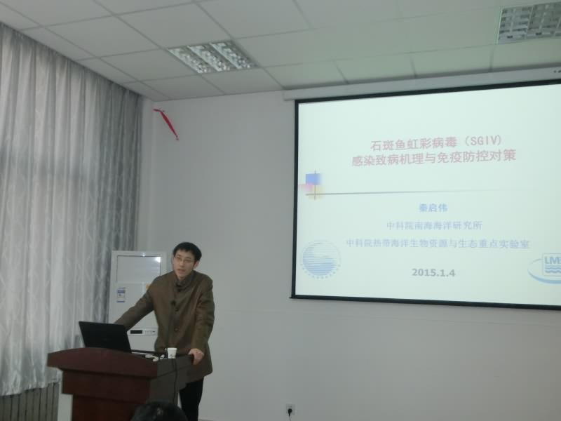秦启伟研究员首先做了题为“石斑鱼虹彩病毒感染致病机理及免疫防控对策”的学术报告。主要讲述了在石斑鱼虹彩病毒新种(SGIV)的分离和鉴定、感染和复制模式、全基因组测序分析、感染后转录组研究、致病机理、检测诊断技术以及石斑鱼免疫和抗病毒功能基因克隆、虹彩病毒疫苗研制等方面的研究历程和成果。随后,秦启伟研究员又为我们做了关于“撰写国家基金申请书的一些体会”的报告,结合他个人在申请国家杰出青年科学基金、重点项目、面上项目等方面的经历,就基金的定位、选题、申请书撰写等方面进行了详细讲解,分享了他申报国家自然科学基金项目的体会。报告结束后,秦启伟研究员和与会师生进行了现场互动交流,对大家提出的问题给予了耐心详细地解答。