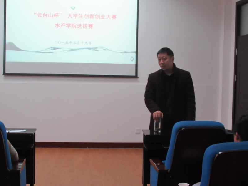 为积极配合我校就业指导中心开展“云台山杯”2015中国河南—美国区域高校大学生创新创业大赛,更好地发掘、培育我院创新创业人才,3月19日下午4点40分,“云台山杯”大学生创新创业大赛水产学院选拔赛在我院202会议室举行。我院党总支副书记李保华、副院长李学军、高云霓博士、李莉博士、田雪博士担当比赛评委。