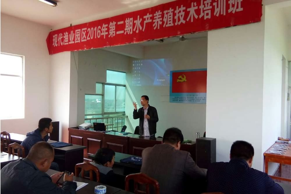 在灌云现代渔业产业园区,技术负责人带领大家参观了园区的养殖基地,并就今后的合作研究、技术支持、人员交流等问题深入交换了意见。张超博士针对园区的实际需求,以常见淡水养殖鱼类的病害防控为主题对养殖户作了一次技术培训。