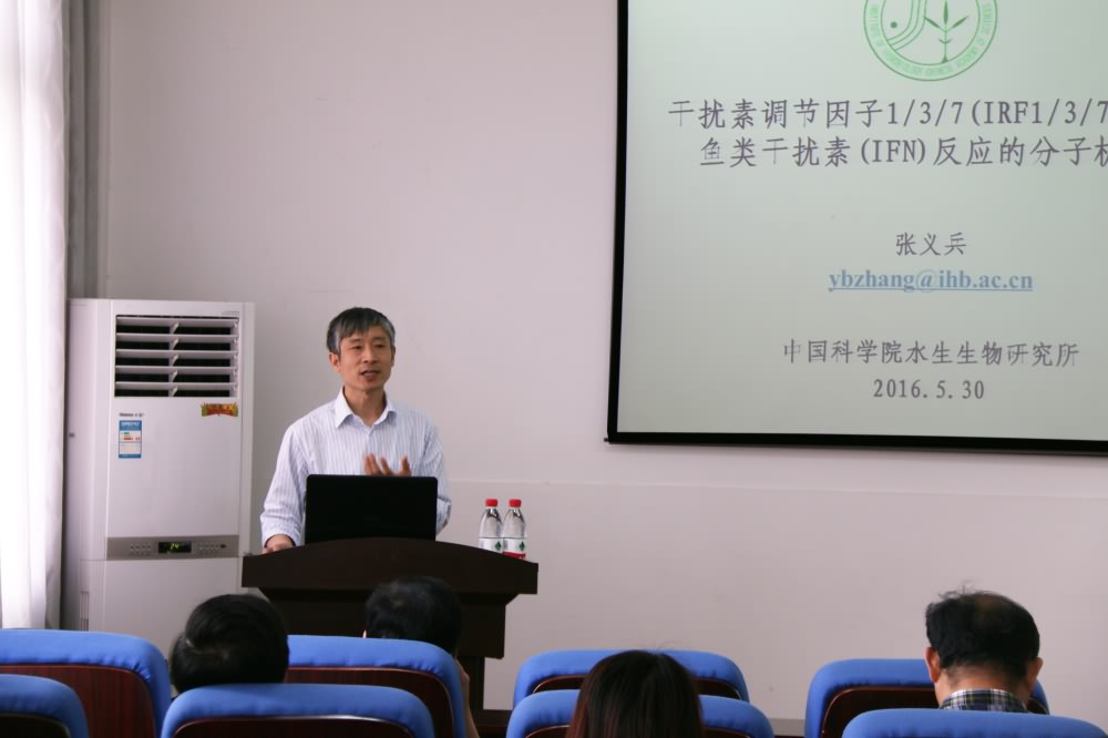 5月30日上午,应学院邀请,中国科学院水生生物研究所博士生导师张义兵研究员在学院二楼会议室做了题为“干扰素调节因子1/3/7调控鱼类干扰素反应的分子机制”的学术报告。学院部分教师、研究生和本科生80余人聆听了报告。报告会由李学军副院长主持。