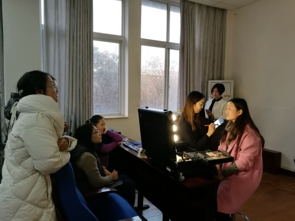 张兰君女士首先带领大家认识色彩的搭配,掌握色调的基本组成,包括暖色系基调,冷色系基调及无明显底色如中色。彩妆需要选择适合色彩和协调的色彩搭配,同时妆容颜色需要与服饰颜色相统一,我们整体形象才会协调、靓丽。接下来张老师依次介绍粉底的选择与使用,眉型的画法;唇妆的选择等。各位老师纷纷提出自己的问题,张兰君女士耐心为大家解答。两名专业化妆师现场实际操作,对两名教工演示如何针对不同脸型、不同气质特点的进行妆容的设计与上妆,两名教工形象有质的变化。最后化妆师还指导各位女教工如何进行修眉,提升自我形象。作为大学教师,一方面需要不断提高自己的知识,品德修养,丰富自己,增强个人内涵,另一方面,还需要在个人形象气质方面不断提升,将美丽、青春的一面展现在学生、同事、家人面前!