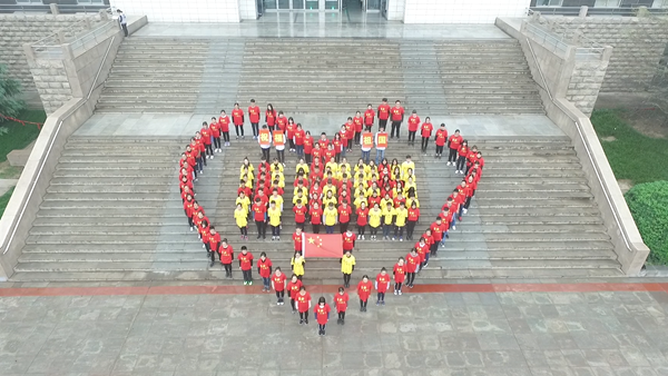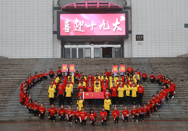 上午课间,140多位同学随着人流聚集在图书馆前,并迅速围成了一个心形,心形中间前面是国旗,随着人浪的上下起伏,由31位同学组成的“十九大”三个字格外夺目,寓意着对党的十九大的深深祝福,最后面四位同学高举“祝福祖国”四个大字,表达着对祖国的美好祝愿。活动最后,活动最后,大家挥舞着手中的五星红旗,在“喜迎十九大,永远跟党走”嘹亮的口号声中圆满结束,旁边围观的师生也跟着同学们一起喊起了口号。