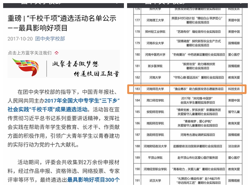 我院组织实施的“‘渔业惠农’助力脱贫攻坚志愿服务项目”获得团中央“千校千项”成果遴选最具影响力项目。