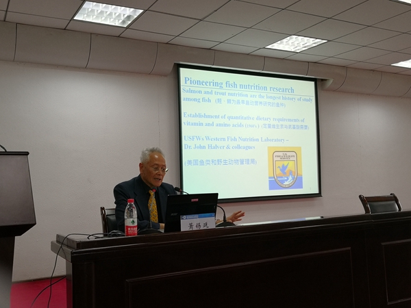 萧锡延教授首先作了题为“鱼类营养的发展与现状”的学术报告,他分别从国际鱼虾营养科学委员会的发展历史、未来发展水产养殖的必然趋势、营养素与营养素间交互作用、营养素的生物有效性及营养素与健康等方面进行了阐述。随后,与会的各位师生就有关水产养殖及SCI论文撰写等相关问题与萧教授进行了交流。