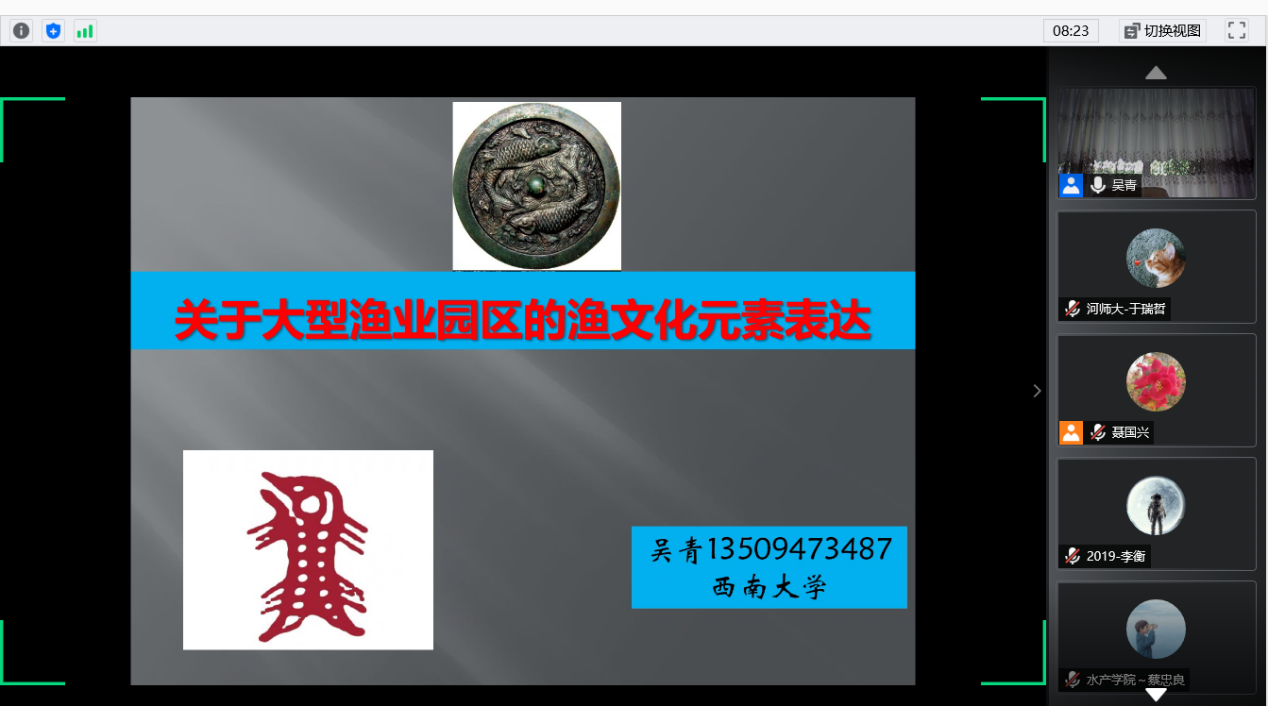 首先,聂国兴院长对吴青教授的此次报告表示了热烈欢迎。随后,吴青教授作了题为“大型渔业园区的渔文化元素”的学术讲座,详细介绍了渔文化的含义及形成因素、渔文化的表现形式和大型渔业园区中渔文化的具体表现等内容。讲座结束后,与会师生就有关渔文化及渔文化元素在渔业园区中的表现形式等问题与吴教授进行了交流。
