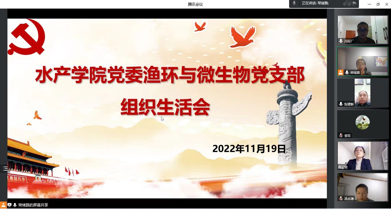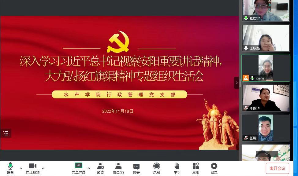 为深入学习贯彻党的二十大精神和习近平总书记视察河南安阳重要讲话精神,根据校党委工作部署,11月18日-20日,水产学院共八个党支部以线上线下相结合方式,组织召开以“深入学习习近平总书记视察安阳重要讲话精神,大力弘扬红旗渠精神”为主题的专题组织生活会。学院领导班子成员以普通党员身份分别参加了所在党支部的组织生活会。