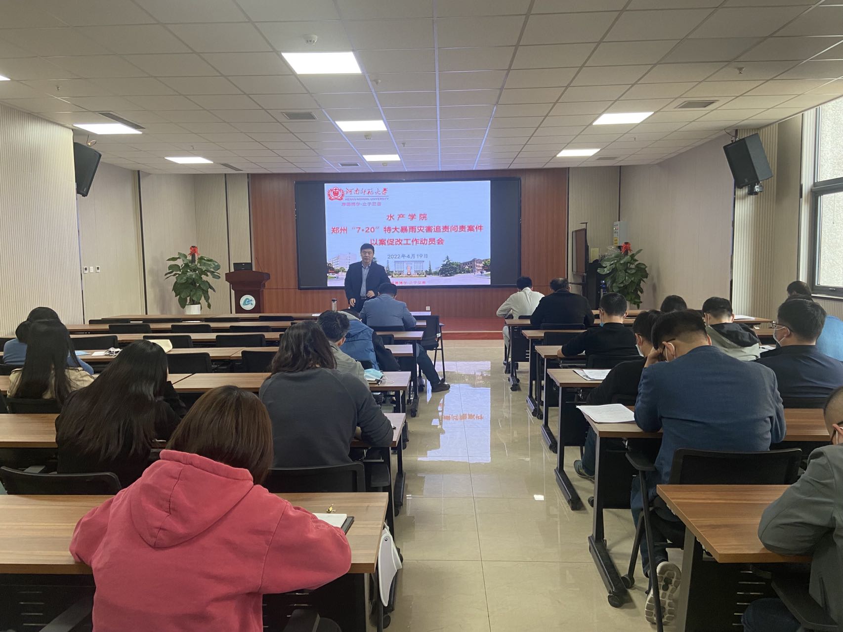 为进一步强化教职工应急处突工作能力,推进“能力作风建设年”活动走深走实,4月19日下午,水产学院组织召开郑州“7•20”特大暴雨灾害追责问责案件以案促改工作动员会,全院教职工参加会议。会议由院党委书记孔祥会主持。