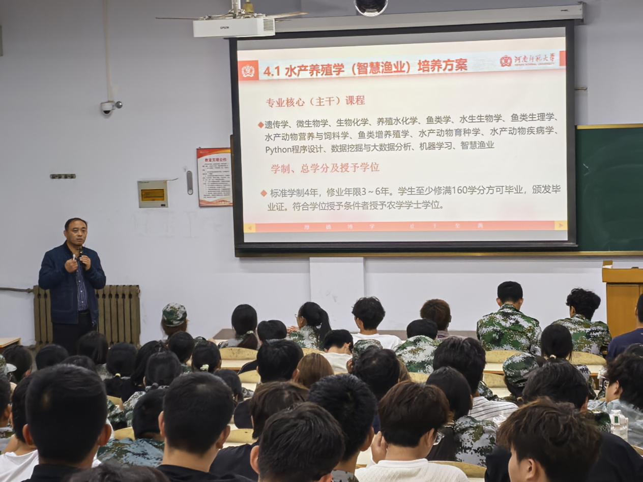 9月24日晚,张建新老师在新554教学楼203教室围绕学院“本科人才培养方案”展开系统解读,详细介绍了水产养殖学-智慧渔业方向及水产养殖学-生物技术双学士学位项目的培养目标、课程体系、毕业要求与发展路径。他强调,学院坚持以学生为中心、以认证为导向、以五育融合为原则,构建了“通识+专业+实践+双创”四位一体的课程结构。张建新还就学业规划、推免政策、学科竞赛、创新创业等学生关心的问题进行说明,鼓励新生尽早确立目标,主动学习,勇于实践,成为具有“三农情怀、全球视野、创新能力”的高素质水产人才。