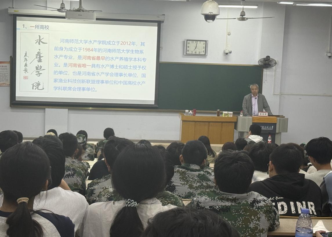 9月22日晚,李学军老师在新554教学楼303教室以《鱼你相遇》为题,用“我从哪里来?我在哪儿?我要往哪去?”三个问题,生动形象地带领新生认识水产学科的起源与发展。他从鱼类的演化历程讲起,引申至水产学院的历史沿革、学科优势与地域特色,并介绍了河南省深厚的文化底蕴与丰富的渔业资源。李学军通过详实的数据展示了学院在保研、考研、就业等方面的优异成绩,指出“读书是通往未来的重要路径”,鼓励同学们珍惜大学时光,夯实专业基础,拓展国际视野,成为“有水一样品格”的复合型人才。