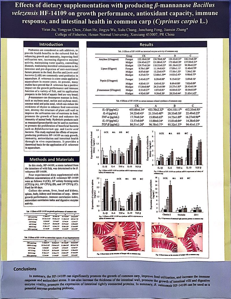 为鼓励学术交流多样化,本届会议开展墙报(POSTER)学术交流形式。课题组研究生康美如、崔文姗、贾一然、袁逍和张晓彤制作墙报并与参会代表进行了广泛的交流。其中贾一然同学题为“Effects of dietary supplementation with producing β-mannanase Bacillus velezensis HF-14109 on growth performance, antioxidant capacity, immune response, and intestinal health in common carp (Cyprinus carpio L.)”的墙报荣获最佳墙报奖。