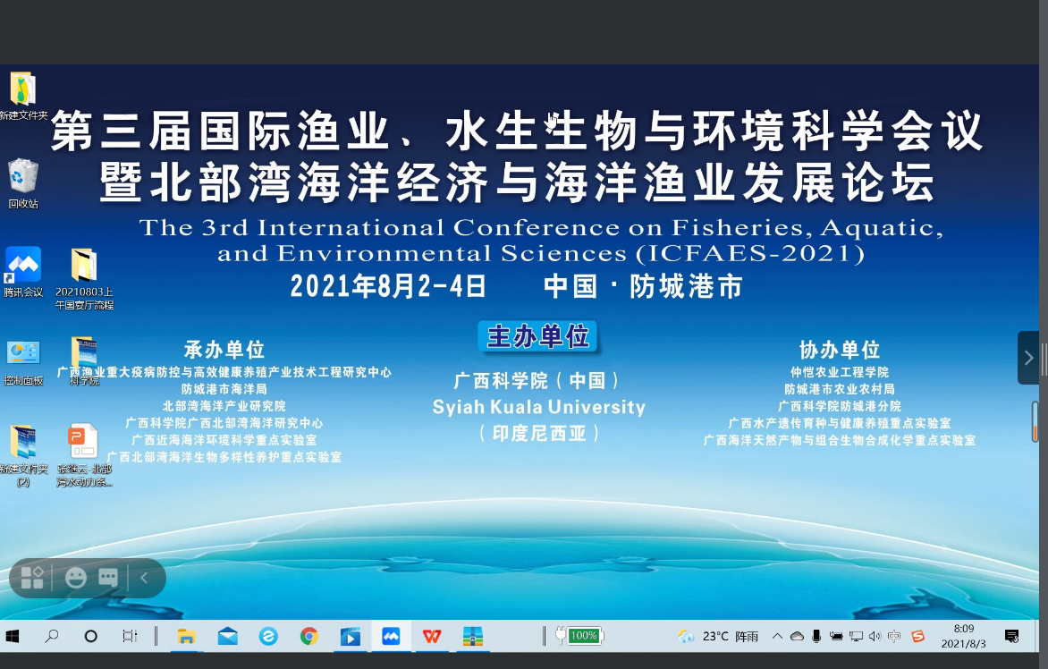 2021年8月2日至8月4日,广西壮族自治区防城港市萨维尔度假酒店召开第三届国际渔业、水生生物与环境科学会议暨北部湾海洋经济与海洋渔业发展论坛,因疫情原因,我院孟晓林副教授受邀于线上参加此次会议。