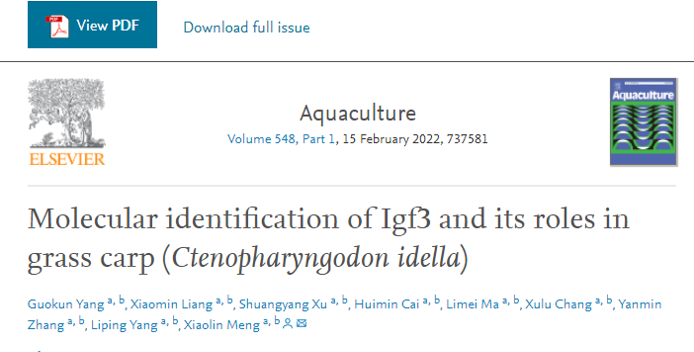 本课题组在Aquaculture杂志发表题目为“Molecular identification of Igf3 and its roles in grass carp (Ctenopharyngodon idella)” 的研究成果。