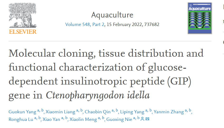本课题组在Aquaculture杂志发表题目为“Molecular cloning, tissue distribution and functional characterization of glucose-dependent insulinotropic peptide (GIP) gene in Ctenopharyngodon idella” 的研究成果。GIP作为重要肠促胰岛素,在哺乳动物的脂质代谢,葡萄糖吸收以及骨细胞代谢过程中发挥关键作用,但关于GIP在鱼类中的功能还鲜有报道。本篇文章以草鱼为研究对象,首先从肠道中克隆到草鱼GIP基因,对其进行表达特性研究。并通过在体和离体实验证实GIP在草鱼中能够通过介导PKA和PI3K/Akt信号通路参与调控葡萄糖和脂质代谢过程,本文的研究可以完善GIP的生物学功能,丰富鱼类的糖脂代谢调控网络。