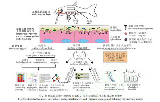 本课题组在水产学报发表文献综述《鱼类黏膜层微生物研究进展》。鱼类黏膜层(主要为皮肤、鳃、肠道等部位)及其共生微生物在调节鱼类黏膜层微环境稳态、促进鱼体健康方面发挥重要作用。本文结合近年来的研究结果,对鱼类黏膜层微生物的群落特征、与宿主的相互作用、影响因素、研究策略和应用价值等方面对鱼类黏膜层微生物的研究现状和存在问题进行综述,为鱼类黏膜层微生物未来研究的发展方向——在生产、实践方面的应用提供理论参考。