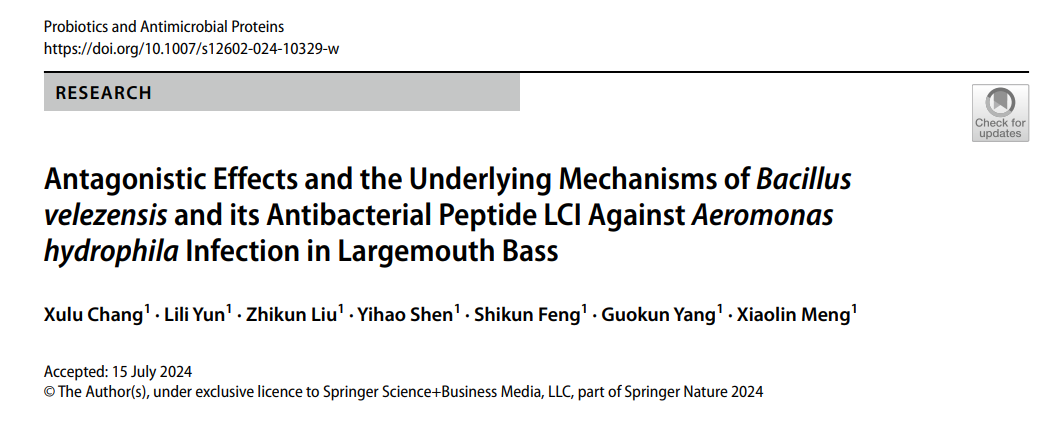 贝莱斯芽孢杆菌(Bacillus velezensis)是一种具有广泛应用前景的益生菌,已证明其代谢产物中含有脂肽、聚酮和细菌素等天然产物。在水产养殖行业中可作为抗生素的替代品。目前尚缺乏从大口黑鲈肠道分离的B. velezensis产生抗菌肽(antimicrobial peptide, AMP)的直接证据,且AMP的潜在作用机制仍不明确。本研究旨在评估大口黑鲈肠道来源的B. velezensis及其AMP LC1在水产养殖中作为抗生素替代品的益生作用及其潜在机制。本研究共选用450尾大口黑鲈鱼(平均体重18.86±0.47g),将其均匀分为五个组:阳性对照组和阴性对照组饲喂基础日粮,1×107组、1×108组和1×109组分别饲喂基础日粮加不同浓度的B. velezensis(1×107、1×108和1×109 CFU/g)。连续饲喂10周后,第11周,阳性对照组和实验组注射半致死浓度的嗜水气单胞菌(Aeromonas hydrophila)菌悬液200 μL,阴性对照组注射200 μL PBS。试验结束后,检测各组的存活率和肝脏细菌负荷。实验结果表明,饲粮中添加B. velezensis Flu1显著提高了大口黑鲈的成活率,并降低了肝脏中的细菌负荷。进一步分析发现,LC1能够下调与嗜水气单胞菌鞭毛组装和肽聚糖合成相关的基因表达,破坏细菌膜的完整性,显著降低生物膜的生物量,并减少嗜水气单胞菌的游动能力。综上所述,B. velezensis Flu1及其代谢产物AMP LC1有望作为水产养殖中控制病原菌的替代抗生素。相关研究成果已在生物学二区的《Probiotics and Antimicrobial Proteins》期刊上在线发表。课题组常绪路老师为第一作者,孟晓林老师为通讯作者。
