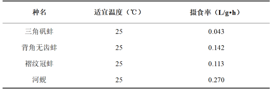 表1 各种蚌类的摄食率及最适宜温度(张许峰等,2008)