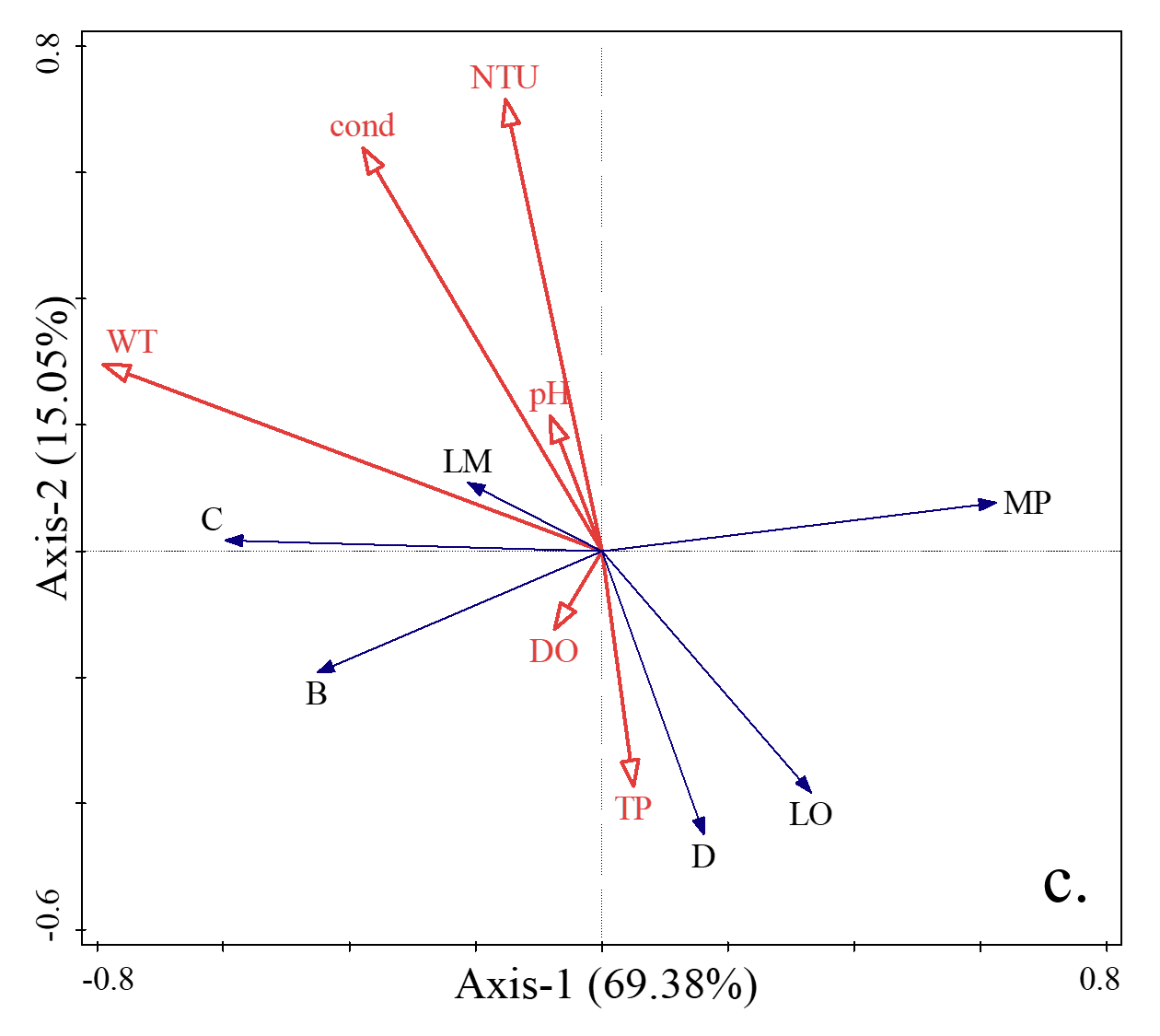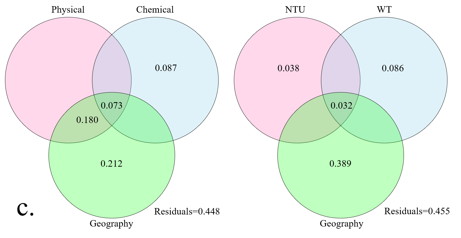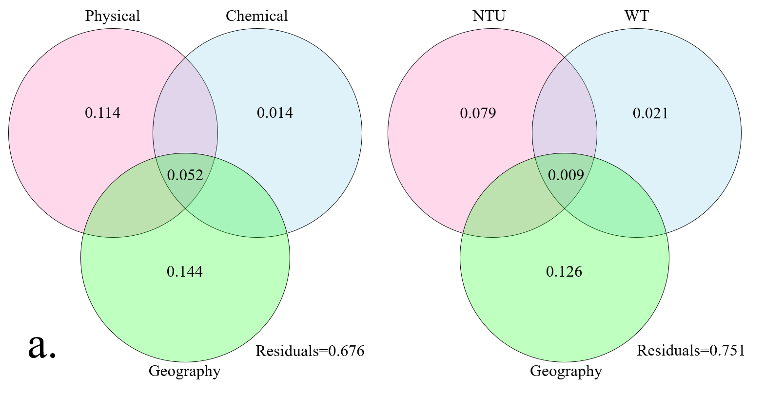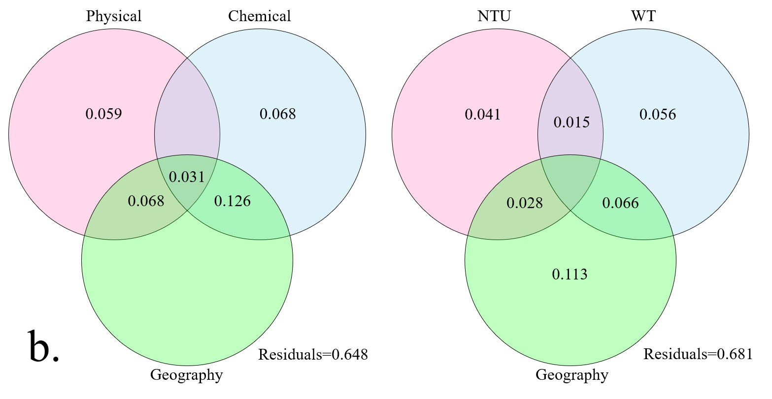 本次调查共鉴定27个浮游藻类功能群,即功能群A、B、C、D、E、F、G、H、J、K、LM、Lo、M、MP、N、P、S1、S2、T、Tc、W1、W2、X1、X2、X3、Xph和Y。此外,通过Anosim相关性分析表明,黄河流域河流和湖泊-水库河段的功能群组成存在显著差异(图1)。在河流流域,功能群MP组占主导地位,而功能群B和J在湖泊和水库中占优势。Mantel相关性检验和RDA分析表明,环境变量,如浊度(NTU)、水温(WT)、电导率(Cond)和总磷含量(TP),是影响黄河流域浮游藻类功能群分布格局的关键因子(图2)。同时,基于VPA分析的Venn图表明,湖泊水库区域的浮游藻类功能群主要受水体WT和TP影响,而河流流域的藻类功能群组成更多的受地理气候变量的影响(图3)。本研究从流域角度解析了黄河流域流动河流和湖库断面浮游藻类功能群组成分布的关键驱动因子,有助于进一步研究河流生态系统中的浮游藻类组成,对河流生态系统的保护和管理具有重要意义。