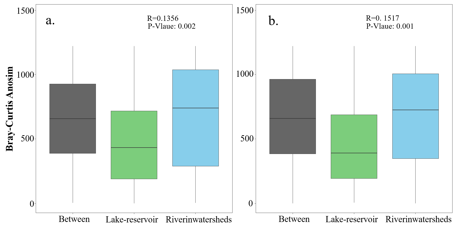 图1 黄河流域河流段和湖泊水库段浮游植物功能群(a,丰度;b,生物量)的Anosim相关性检验分析