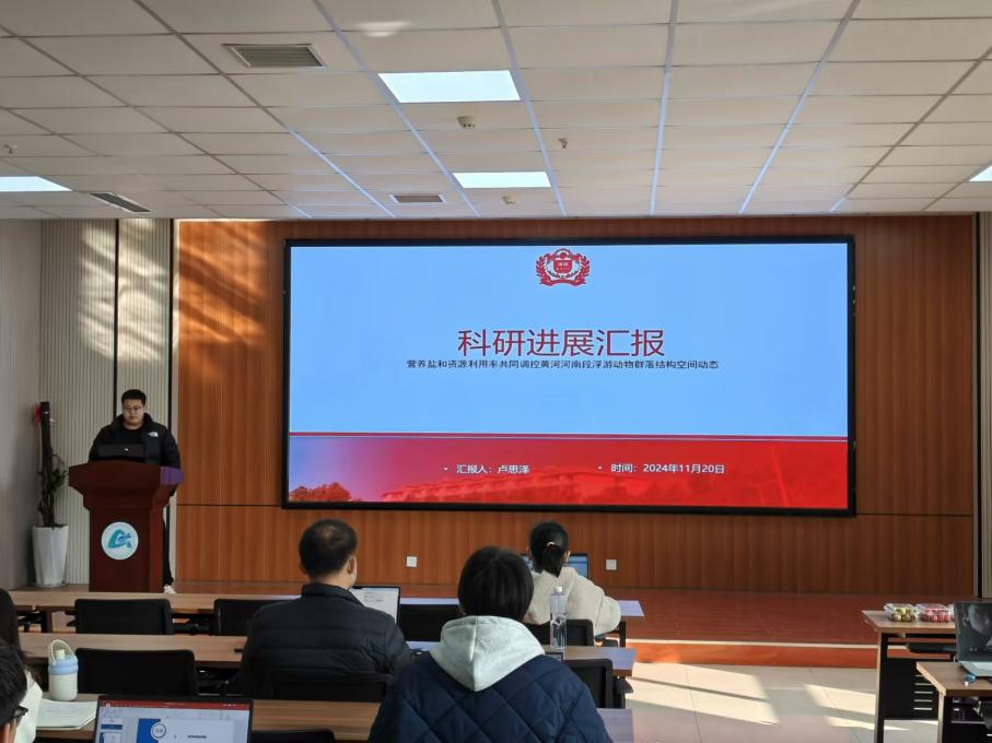 研三卢思泽同学进行了科研进展汇报,题目为《营养盐和资源利用率共同调控黄河河南段浮游动物群落结构空间动态》,其研究为黄河下游在监测河水生态保护提供了重要数据,强调浮游动物在水生态系统中的关键作用。