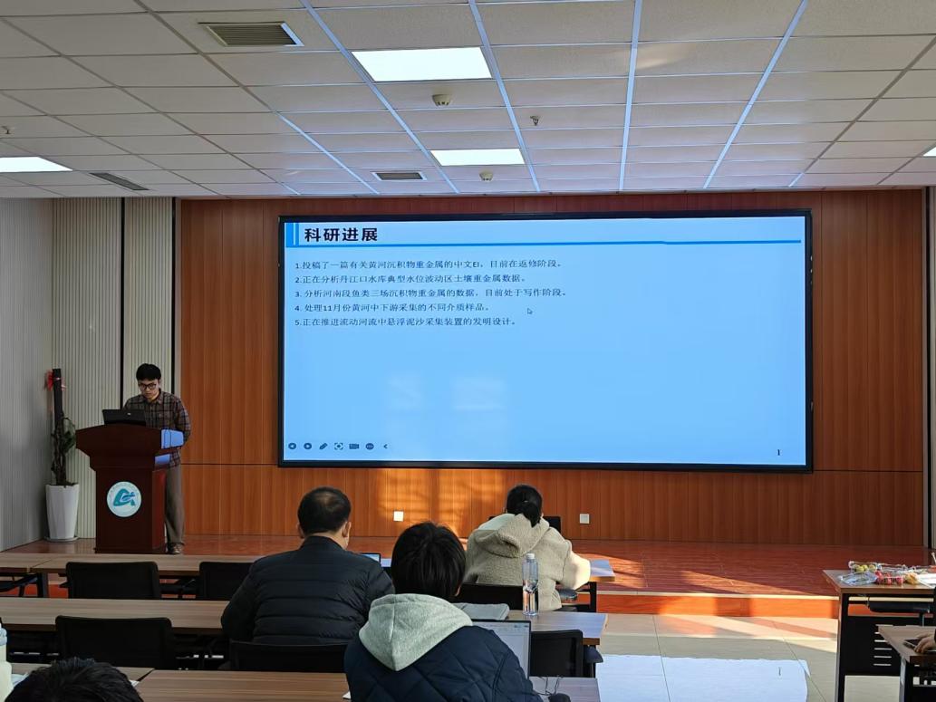 研二丁厚宽同学也对近期的科研进展工作进行了汇报,首先投稿了一篇中文EI,目前正在返修阶段;其次正在对丹江口水库典型水位波动区土壤重金属数据、河南段鱼类三场沉积物重金属数据进行分析以及处理11月份黄河中下游采集的不同介质样品;最后,介绍了目前正在开展的河流中泥沙采集装置的发明设计。