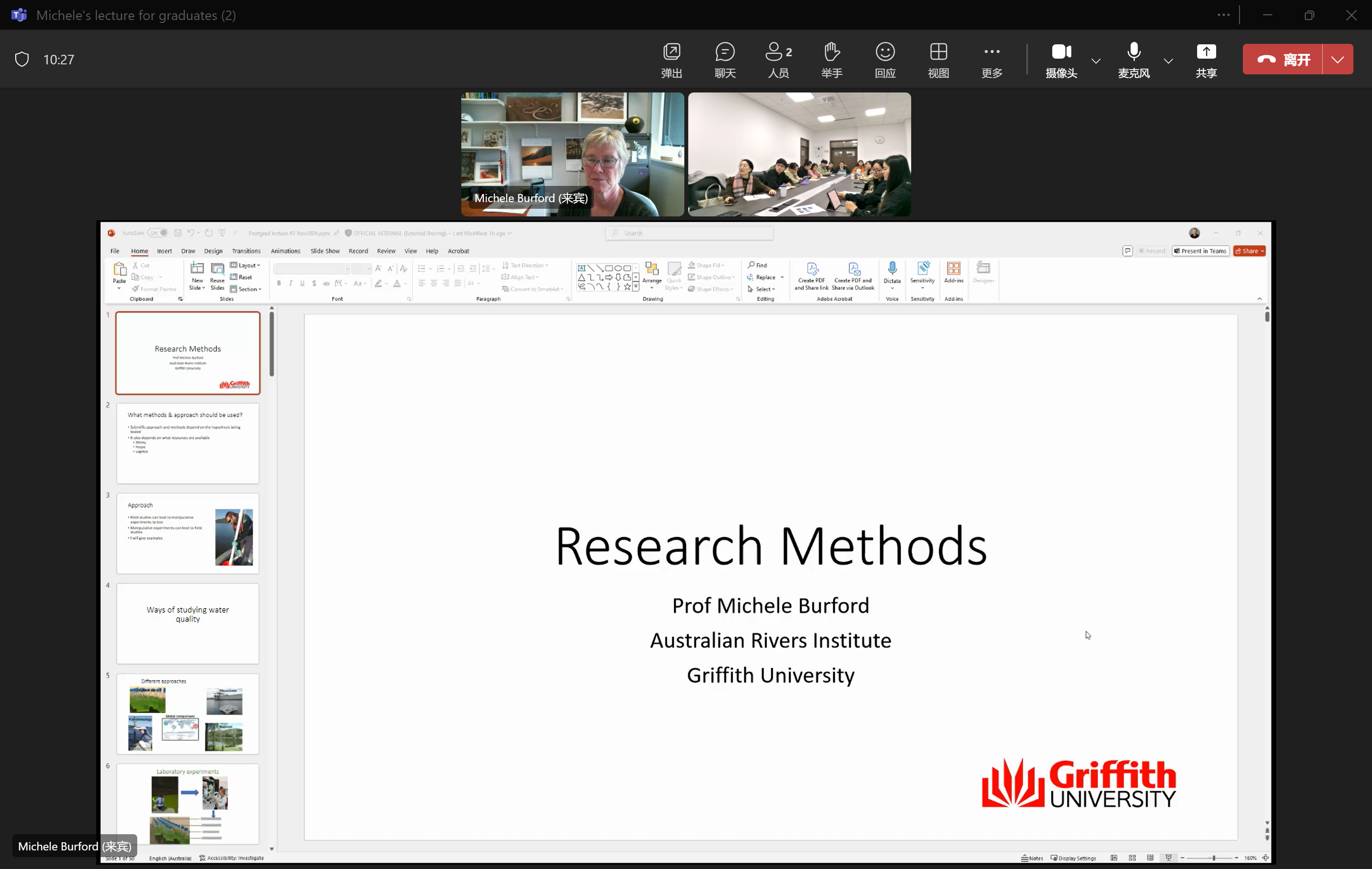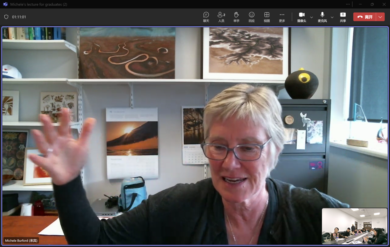 2024年11月16日,我院邀请澳大利亚格里菲斯大学Michele Burford教授在实训楼205会议室为2024级硕士研究生做题为“Research Methods”的线上讲座,报告会由硕士研究生课程《渔业资源与水环境保护》授课教师高云霓副教授主持。