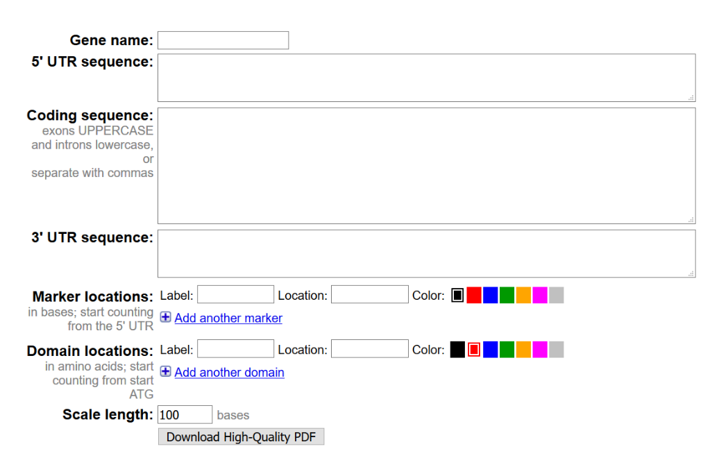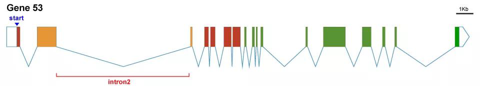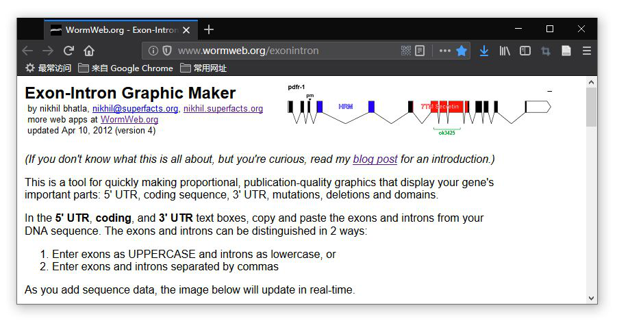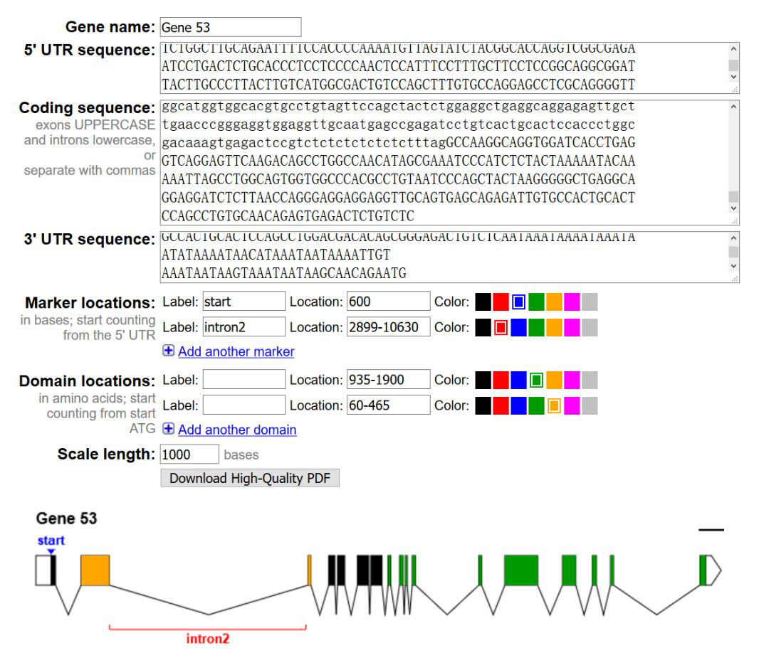 Exon-Intron Graphic Maker是一个绘制基因结构的在线小工具,它可以根据序列长度等比例绘制gene的结构元件,比如5' UTR、 CDS、 外显子、内含子、突变位点、结构域、3' UTR等。
