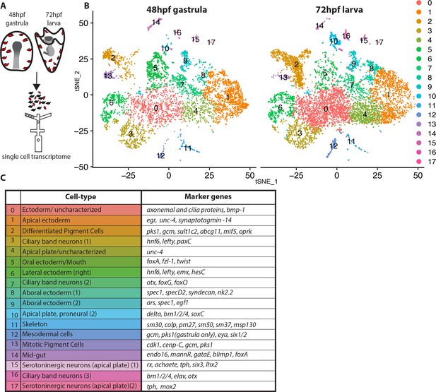 通过drop-seq技术和RNA测序的细胞分离(B)原胚期(48hpf)和幼体期(72hpf)的富集外胚层细胞类型的tSNE图(C)总结每个最具有标记基因的细胞类型