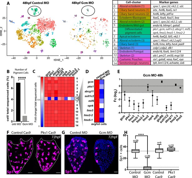 原肠胚期对照组MO和gcm MO单细胞测序 (B)在对照组MO与gcm MO实验组中,色素细胞相对于总测序细胞的百分比 (C)与对照Mo相比,gcm MO中色素基因的表达 (D)色素基因表达水平热图 (E) 原肠胚期gcm MO中色素基因定量 (F) Cas9敲除pks1后,色素细胞的分布变化 (G) gcm MO早期幼体(72hpf)的Sp1抗体染色 (H)与对照组相比,gcm MO中Sp1阳性细胞数量减少