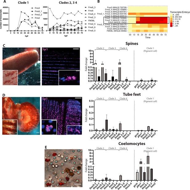 (A,B)在受精后0至72小时(hpf)胚胎中4个fmo分支的转录本丰度 (C、D、E)棘突、管足