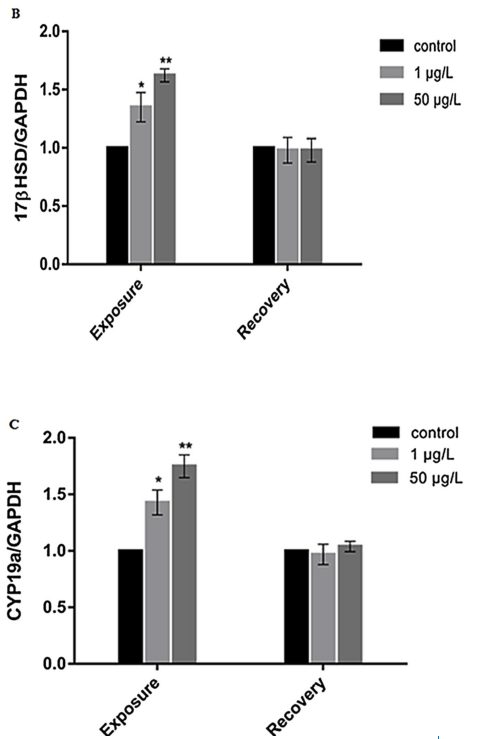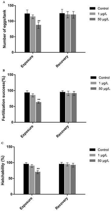 在 1μg/L 处理的雌性中,产卵数、受精率和孵化率略低于对照组,但在 50μg/L 组中观察到上述所有参数均显着降低(P < 0.01 )(图 2A、B 和 C)。 恢复时,所有繁殖参数值都恢复到对照水平(图 2A、B 和 C)。