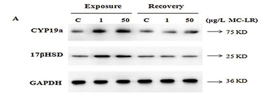 暴露21 d后,处理组(1和50μg/L MC-LR)的卵巢蛋白(17βhsd和cyp19a)表达极显著升高(P < 0.01)(图6A-C)。