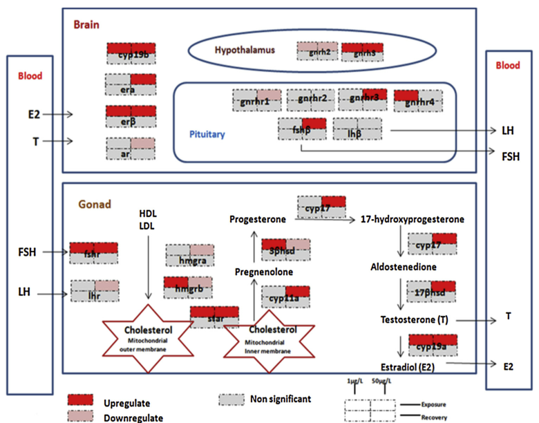 硬骨鱼的发育和生殖是由HPGL-轴上的基因与类固醇生成途径相关基因之间的相互作用调节。促性腺激素释放激素(gnrh)由下丘脑释放,刺激促性腺激素的释放,包括垂体促卵泡激素(FSH)和促黄体生成素(LH)。通过与促性腺激素受体结合,诱导雌鱼的配子发生。有研究报道,MCs可能通过影响性类固醇激素的产生和HPG轴基因转录水平的改变来影响鱼类繁殖。