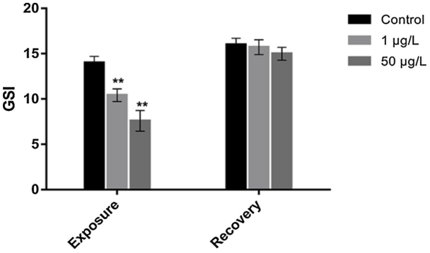 MC-LR暴露21 d后,雌性斑马鱼的GSI在两个处理组中都受到MC-LR的显着影响(图1)(P < 0.01)。 在恢复期结束时,两个治疗组的GSI 都回到了对照水平。