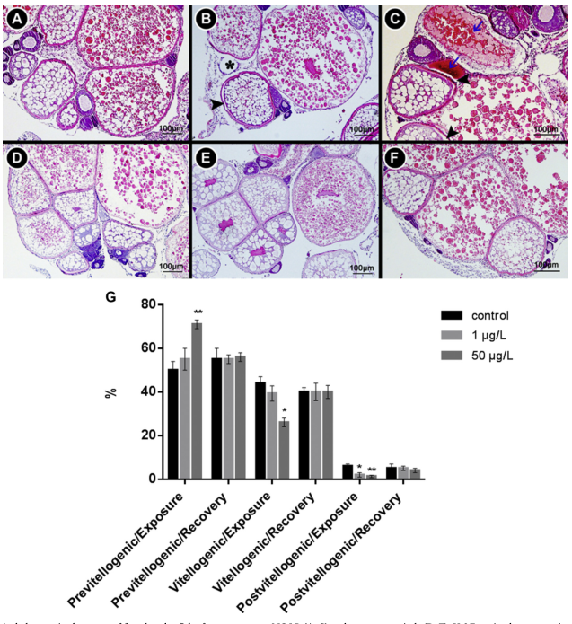 图3. (A):对照组,(B):1 μg/L组,(C):50 μg/L组,黑色星号:性腺组织空泡化。黑色箭头:卵母细胞和滤泡细胞层之间失去接触。蓝色箭头:退化成熟的卵母细胞。(G)雌鱼卵黄发生前、卵黄发生中和卵黄发生后卵母细胞的百分比。