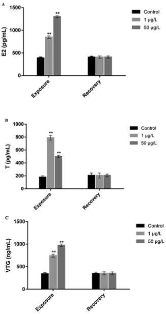 图4. MC-LR对21 d暴露/恢复期雌性斑马鱼血浆 (A):17β雌二醇(E2)、(B):睾酮(T)、(C):卵黄原蛋白(VTG)水平的影响。