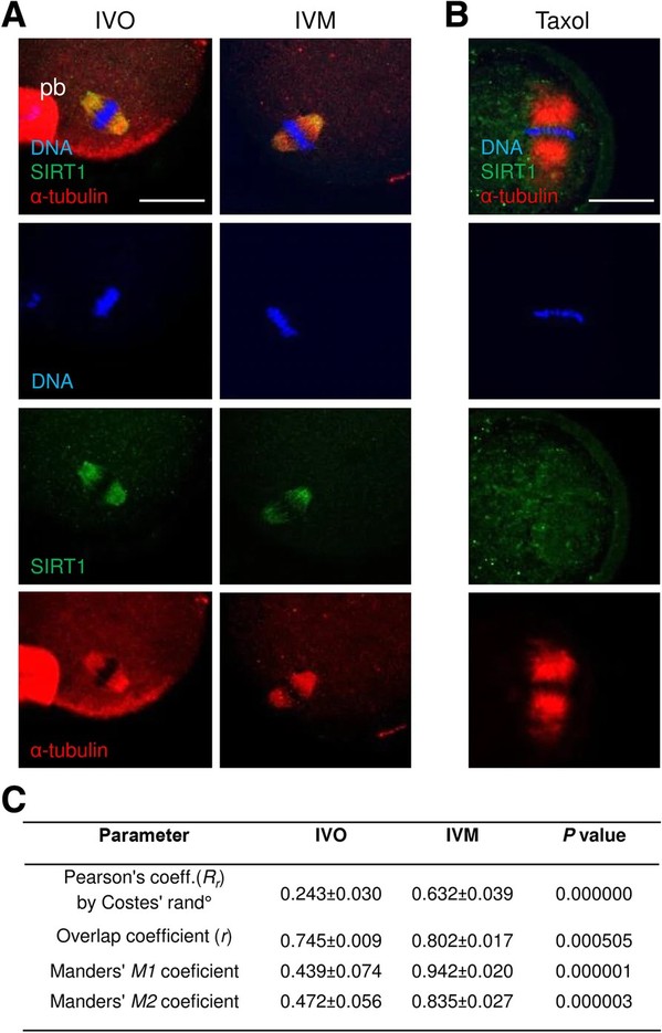 经Taxol处理后的卵母细胞中SIRT1与α-微管蛋白没有关联,同时在体内成熟卵母细胞与SIRT1的关联较弱,活体成熟卵母细胞和经Taxol处理的卵母细胞中的发现,SIRT1和α微管蛋白结合减少表明成熟卵母细胞的纺锤体已准备好,以便在受精后发生后续变化。