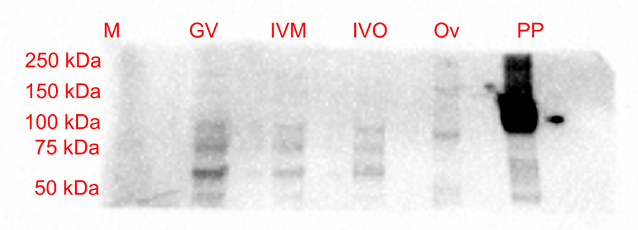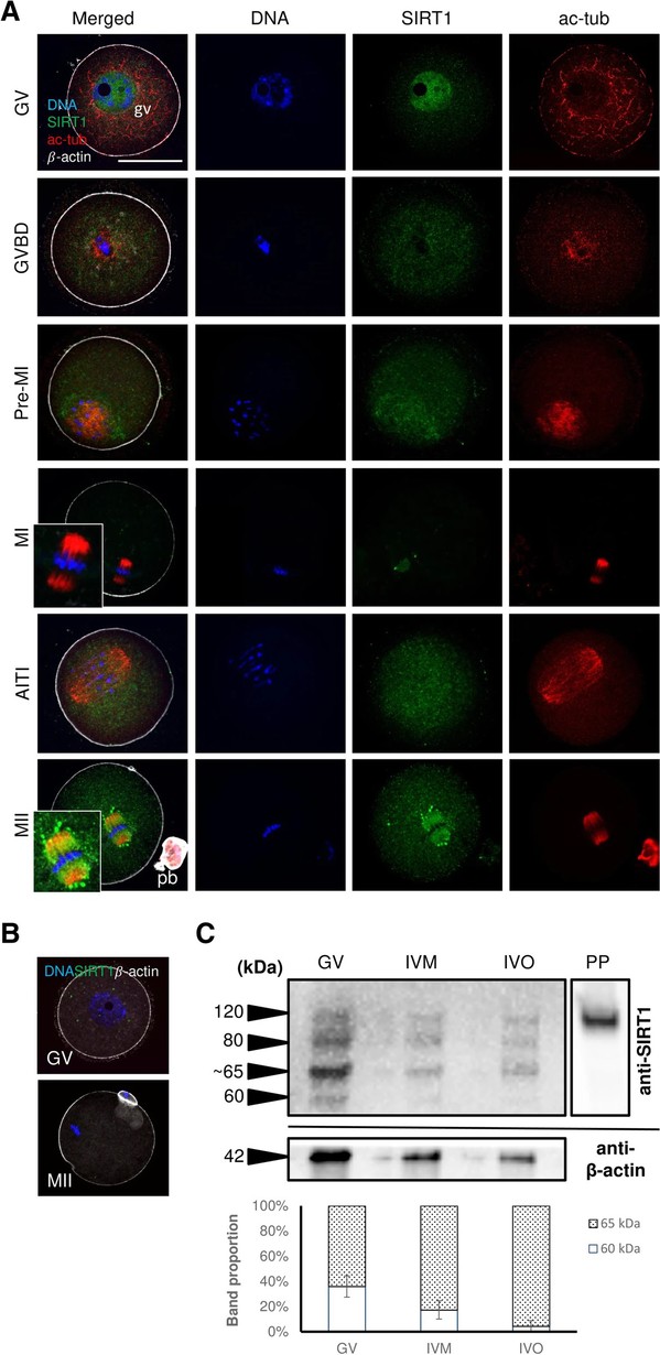 SIRT1仅位于生发泡(GV)时期的未成熟卵母细胞细胞核中,在卵质中只有微弱的信号。一旦减数分裂重新开始,SIRT1在NEBD时期卵母细胞的卵质中弥散分布。MI 期 SIRT1信号几乎消失,MII 期 SIRT1显现纺锤体样式,WB检测到预期SIRT1的120 kDa 条带和约80 kDa条带(还观察到60kDa和~65kDa的条带,其中考虑了SIRT1亚型2(59.9kDa)。成熟卵母细胞中的60 kDa条带消失,而65 kDa条带保留。
