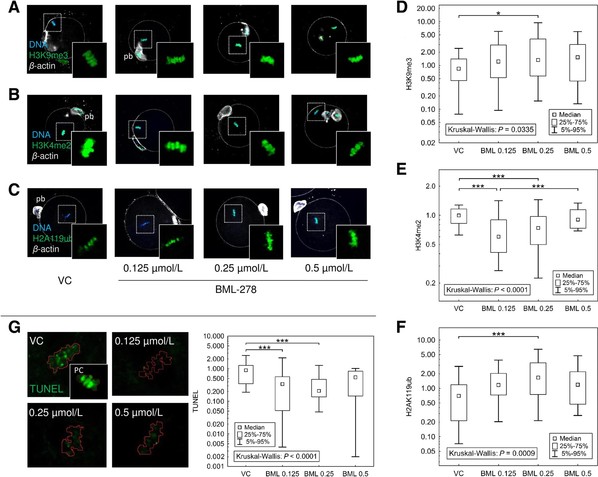 虽然0.25μmol/L BML-278处理下, H2AK119泛素化升高,但是0.25μmol/L BML-278处理细胞凋亡下降,表明BML-278处理没有损伤DNA,TUNEL分析评估BML-278激活SIRT1对DNA保护作用。VC空白对照,PC阴性对照。综上所述,BML-278处理后,SIRT1改变了成熟卵母细胞的组蛋白编码和染色质质量,而且NEBD时期SIRT1信号消失,表明SIRT1改变组蛋白编码仅局限于GV时期。