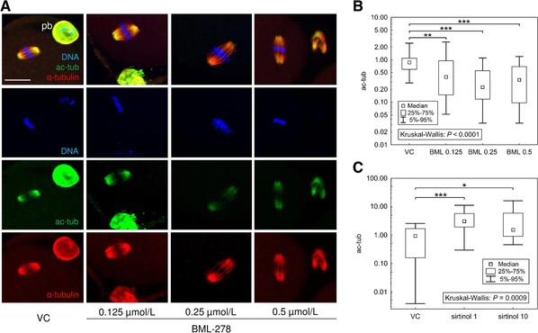 在0.25μmol/L BML-278处理下α微管蛋白乙酰化降低,sirtinol(选择性SIRT1和SIRT2脱乙酰基酶抑制剂)处理后,α-微管蛋白乙酰化增强。